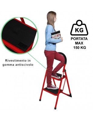 La scala a gradini multiuso è un accessorio indispensabile per affrontare con facilità le attività quotidiane in casa. Costruita con una robusta struttura tubolare in acciaio da 25 mm verniciata a polveri con un vivace colore rosso, offre stabilità e resistenza. Gli ampi gradini sono rivestiti con una superficie antiscivolo che assicura un appoggio sicuro durante l’uso. Il design pieghevole consente di richiuderla completamente, rendendola compatta e facile da riporre anche in spazi molto ristretti, come dietro una porta o sotto un letto. È dotata di piedini antiscivolo che aumentano la stabilità e di un maniglione di sicurezza con presa ergonomica, utile sia per una presa più salda che per spostarla agevolmente. Versatile e pratica, può essere utilizzata non solo come scala per piccoli lavori domestici, ma anche come sgabello. Può sostenere un peso massimo fino a 150 kg.