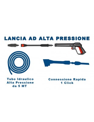 Tubo ad Alta Pressione: Con innesti rapidi, una lunghezza di 5 MT e pensato e realizzato per gestire al meglio la pressione della macchina e durare nel tempo