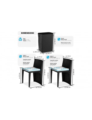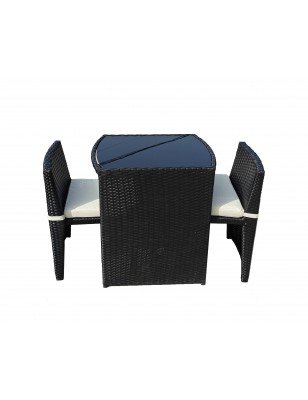 Ideale anche per chi ha degli Spazi Ridotti di cui usfruire grazie al Design Salvaspazio delle Due Poltrone che compongono il Set, che vanno a Scomparire all'interno del Tavolino, permettendo così la Collocazione di questo Splendido Set di Mobili in qualsiasi Ambiente Esterno.