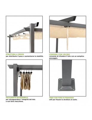 A corredo ci sono cinque barre scorrevoli in Alluminio misura 20 x 40 mm che sostengono il Telo in Poliestere da 180 gr/mq e che assicurano il movimento di chiusura ed apertura della pergola in totale sicurezza e con facilità inoltre all'interno della pergola, è presente un tubo in acciaio dal diametro di 19 mm che garantisce la continuità del movimento e facilita le operazioni di apertura e chiuisura della pergola.